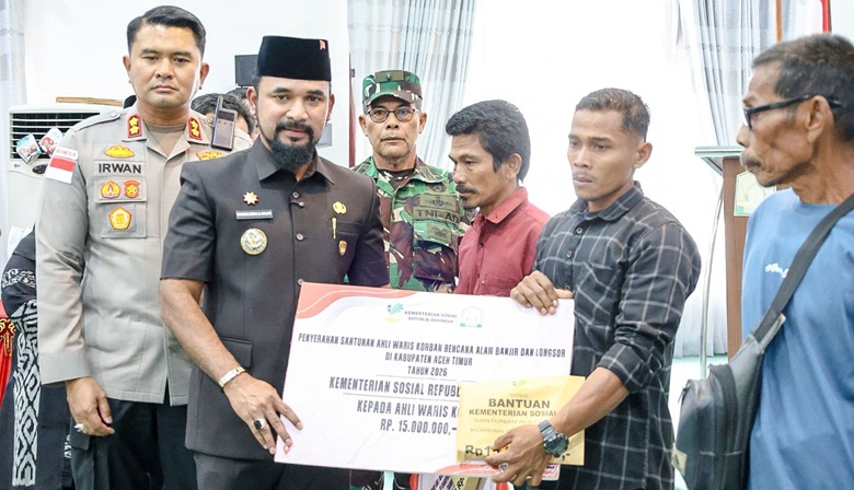 FREELINENEWS.COM | ACEH TIMUR — Bupati Aceh Timur Iskandar Usman Al-Farlaky, S.H.I, M.Si menyerahkan santunan kepada ahli waris korban bencana alam banjir dan longsor di Kabupaten Aceh Timur. Penyerahan santunan tersebut berlangsung di Aula Serbaguna Pendopo Idi, Kamis (29/1/2026).
