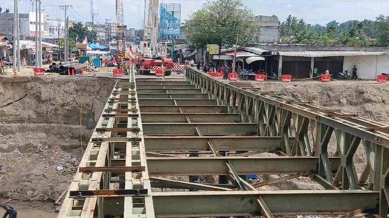 “Pembangunan jembatan Baeley ini realisasinya sudah 80 persen tinggal kita dorong ke tepi Medan sekitar 15 meter sampai jarak aman dari tepi dan kita lanjutkan pemasangan lantai dan rangkaian jembatannya.