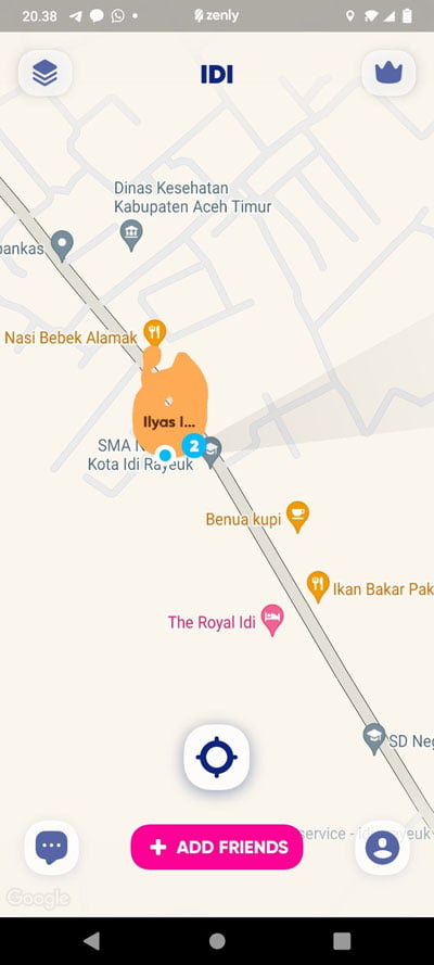 - Nah selain bisa mengetahui lokasi Anda secara langsung, Anda juga bisa melacak lokasi teman asalkan mereka juga sudah mendaftar dan menggunakan aplikasi Zenly. (Ambil HP Teman Anda secara diam-diam dan Instal Aplikasi Zenly juga. Lokasi teman Anda sendiri ditandai dengan ikon berwarna hijau atau di nomor dua seperti gambar di atas.