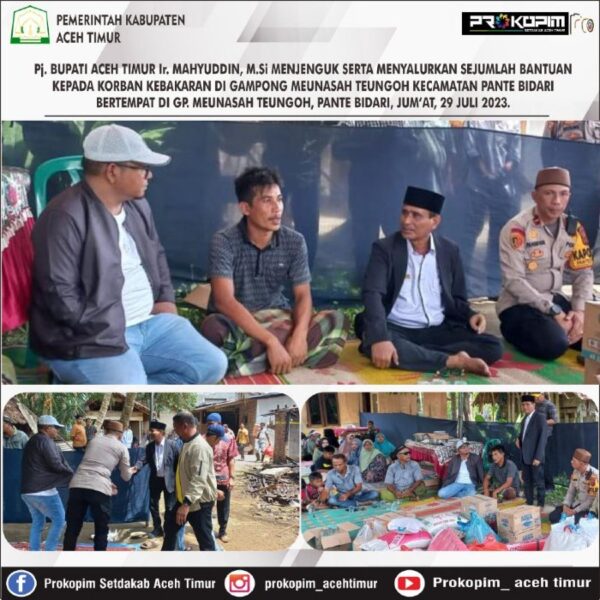FREELINENEWS.COM | ACEH TIMUR – Pejabat Bupati Aceh Timur Ir. Mahyuddin, M.Si menjenguk sekaligus menyalurkan bantuan uang tunai untuk korban musibah kebakaran yang menyebabkan dua orang bocah meninggal dunia di Desa Meunasah Teungoh, Kecamatan Pante Bidari, Aceh Timur pada Jumat (29/7/2023)