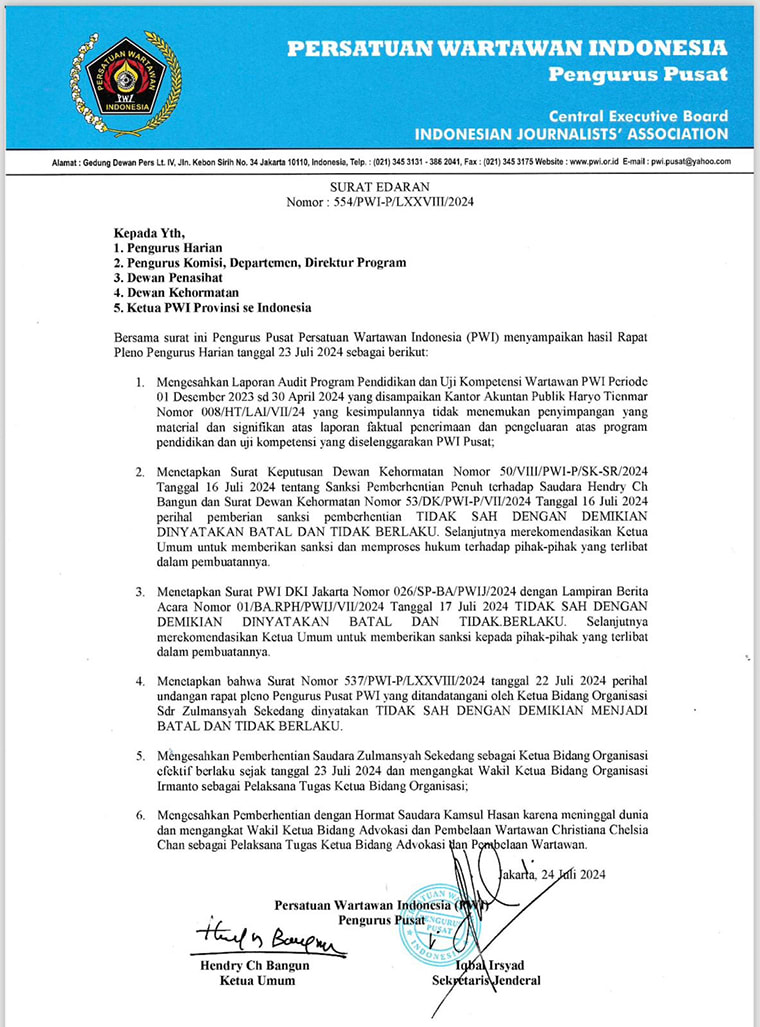 Berikut kutipan Surat Edaran Nomor: 554/PWI-P/LXXVIII/2024 Tanggal 24 Juli 2024.