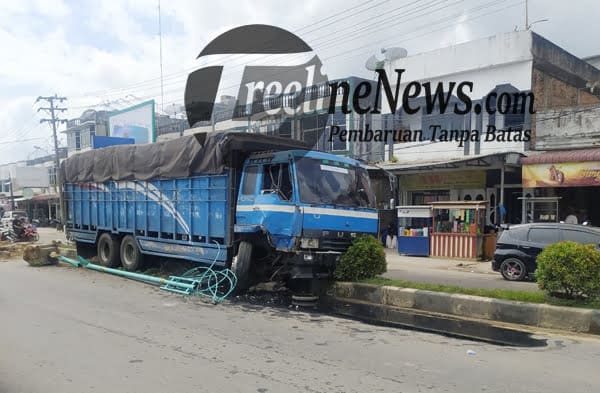 FREELINENEWS.com | Aceh Timur- Akibat kerusakan ketrik sistem kemudi (Power Steering) macet, satu unit truk tronton Fuso BL 8547 EA, bermuatan barang kelontong dari Medan menuju Banda Aceh, menabrak trotor jalan dua lajur di Kota Idi Rayeuk, Aceh Timur, Kamis (25/03/2021) sekira pukul 4.30 pagi.